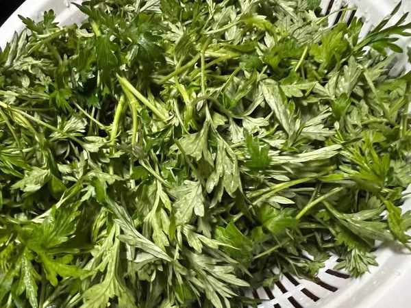 2、鮮嫩的艾葉尖,放到鹽水中浸泡殺菌。接著在流動的水中洗3-4遍,徹底洗凈,然後瀝幹水分。