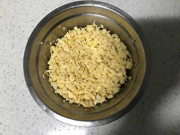 3、另外準備兩三個雞蛋,先在鍋裡把雞蛋炒熟,裝進碗中晾涼。鍋內另外再多加一些油,放些蔥花炒香。然後把油晾涼。