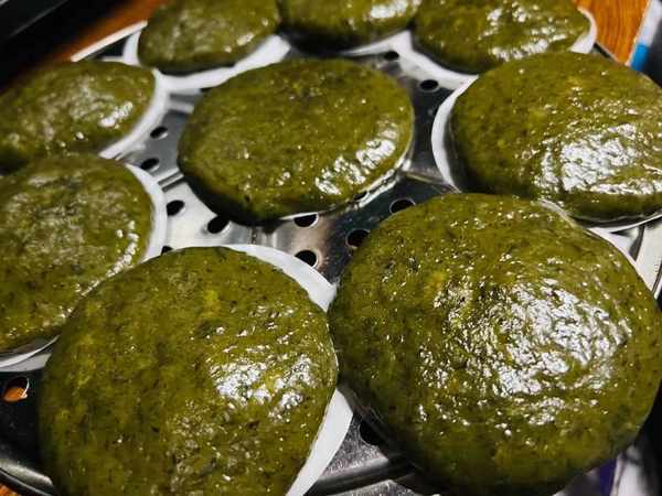 6、把整理好的艾粄放到篦子上,要墊上不粘油紙或是其他的葉子,水開以後繼續蒸十五分鐘即可關火。蒸熟之後可以直接吃,也可以用油煎一下,或是在烤箱中烤一烤,口感更好。