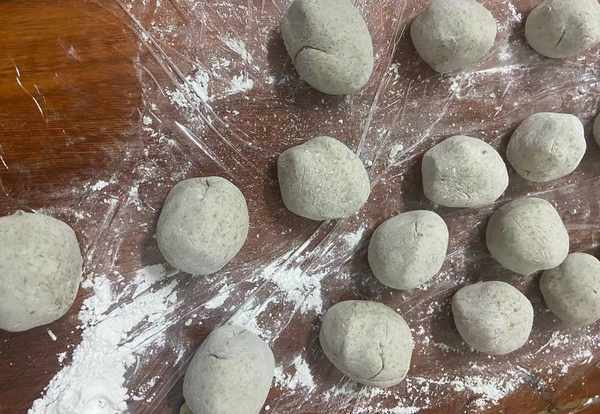 5、接著將面團拉成長條狀,進一步搓一搓,使長條的粗細均勻些,然後切成小塊。接著將小塊的面團中包入餡料,整理成簡單的形狀即可。