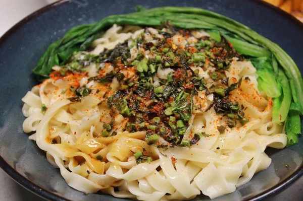 4、接著在煮面的湯汁中放一些青菜燙熟。將面條撈出裝碗,放上青菜,以及準備好的各種配菜料汁,接著燒一些熱油,潑到碗中,在滋滋作響的熱氣中,面條的香味就出來瞭。接著拌勻即可享用。