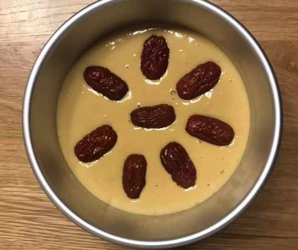 4、面糊中出現密集的氣泡,並且液體明顯升高,此時發酵完成,把紅棗放進去。