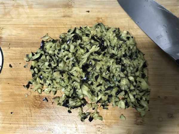 2、鮮嫩的圓茄子一個,洗凈之後,切成細絲,放一些食鹽抓勻,然後包入紗佈中,把水分擠出去。接著再次放到案板上,進一步切碎。