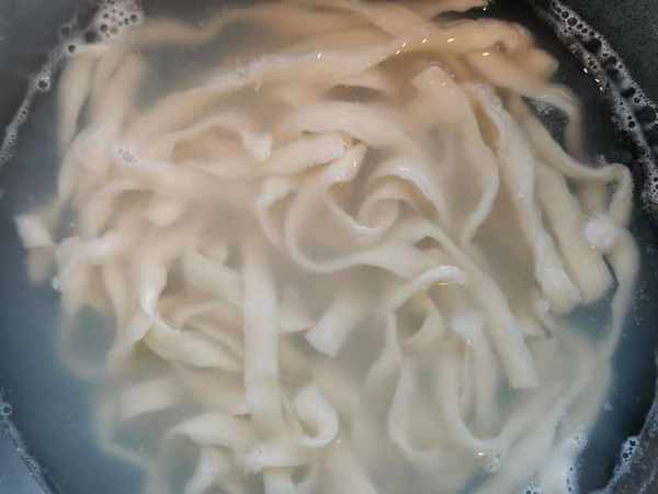 3、鍋中加寬水煮開,把面條放到鍋裡,煮兩三分鐘,將面條徹底煮熟,然後撈出來,盛放到溫水中。