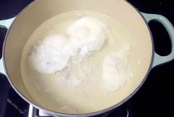 1、在鍋內加入適量的白開水,慢慢煮開,有小氣泡冒出時,把雞蛋逐個打入水中,在打的時候盡量離鍋內的水近一些,這樣蛋液不容易散。