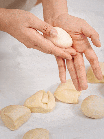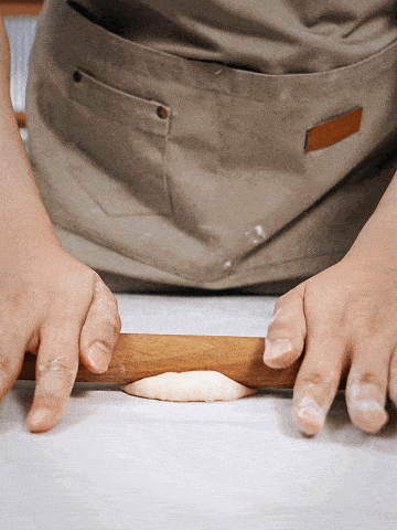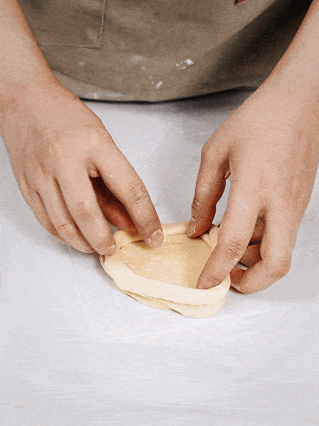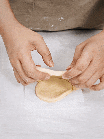 靜置結束後,拿出一個,搟壓成9-10cm直徑的圓形,然後用8cm的刻圈刻出邊緣,拿起邊緣面團,交叉出兩個圈,輕輕拉扯變大環成兩圈