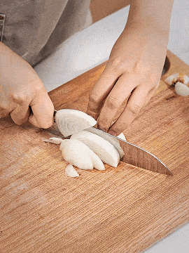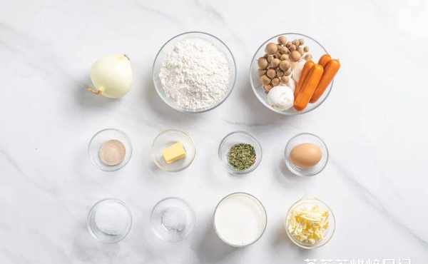 2、發酵期間我們來做白汁醬:白洋蔥半個,切條、50g白蘑菇切片、4根脆皮腸斜切(用刀尖戳一下更好切開脆皮),把50g蟹味菇一根根撕開,比較粗大的可以對半撕開一下。