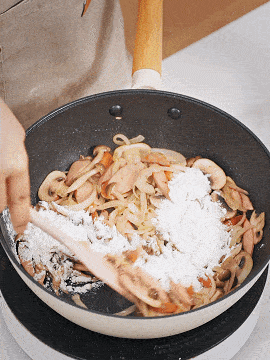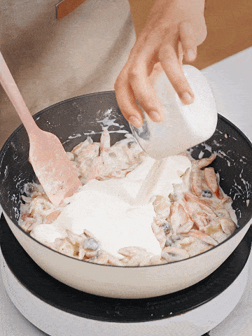 轉小火,倒入35g低筋面粉,然後讓所有的食材都均勻地粘上(這是白汁濃稠的關鍵哦),然後把200g的牛奶分次加入,粘稠後再加下一次(避免面粉結塊嚴重),再加入150g淡奶油,增加白汁的香氣和濃厚感。翻炒成粘稠的糊糊狀態,最後根據自己的口味添加鹽及黑胡椒,倒入碗中,貼面保鮮膜靜置降溫備用。
