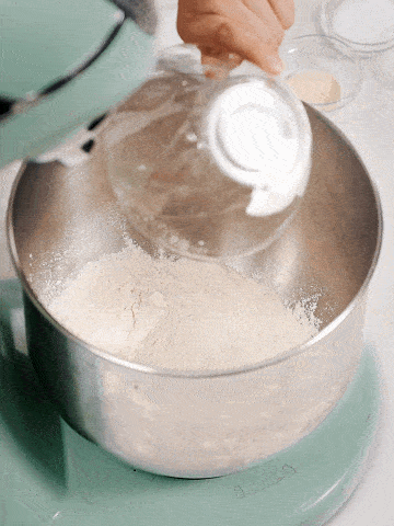 1、先來做面團部分:揉面缸中倒入225g高筋面粉、4g酵母、20g砂糖、3g海鹽、40g雞蛋液、110g水,低速攪拌成團,中高速攪打5-6分鐘,至面團出粗膜後,加入20g軟化黃油,繼續中高速攪打6分鐘,面團能扯出薄膜即可