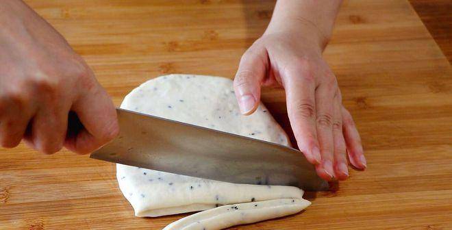 4、醒發好以後,把面團取出放在案板上,借助搟面杖的力量把它搟成薄片,再切成均等的長條,用手把每一根長條搓細。