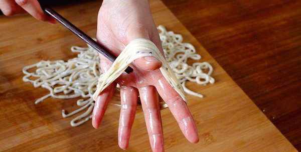 7、 浸泡好以後,把面條從碗裡面取出來,用手慢慢把它們拉成細長的面條,接著把面條繞在手掌上面,旋繞好以後更換兩根長長的筷子,繼續抻拉面條。