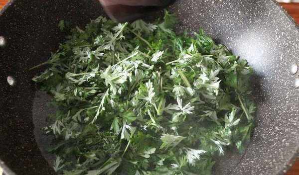 1、 艾葉清洗幹凈放入鍋中焯水,撈出過涼水,瀝幹水分切成碎末。