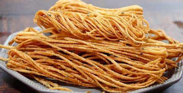 9、 鍋中倒油,把面條下入鍋中炸制,等面條定型以後把筷子抽取出來,炸到表面金黃酥脆即可撈出。