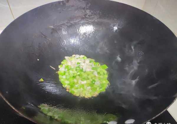 4.鍋中倒入油,將油燒熱,油熱瞭之後,我們再把青蒜苗放入油鍋中用小火煸炒一下,把它們炒出香味來,這個過程中要用小火慢慢炒;