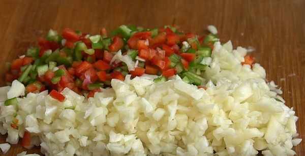 3.準備一把大蒜,把它剁成碎末,再切點青紅椒,切成小碎丁備用。