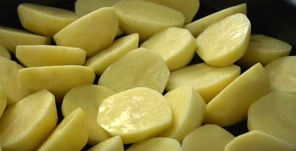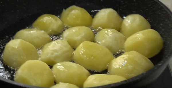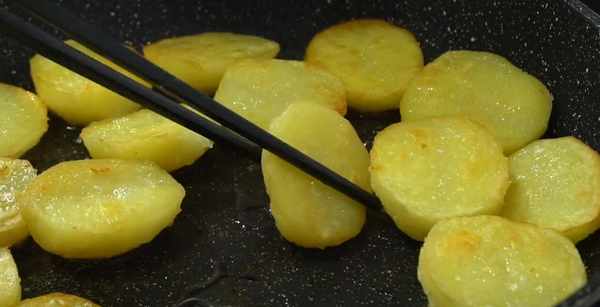 5.起鍋倒油,油熱下入土豆,開小火煎。