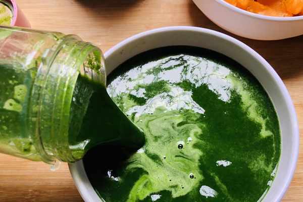 6.把菠菜打成汁後,倒入碗中備用,然後把料理機洗凈。