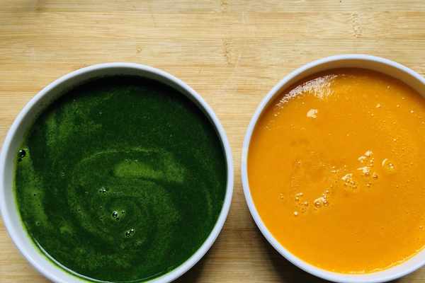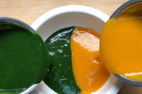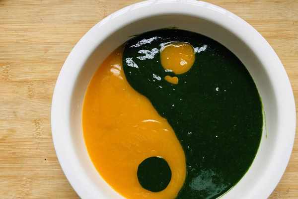 1.盡量選擇兩樣食材密度差不多的,比如文中的菠菜和南瓜,不然很難形成太極的雛形。