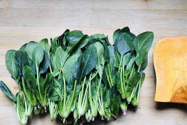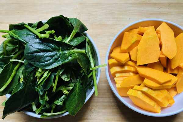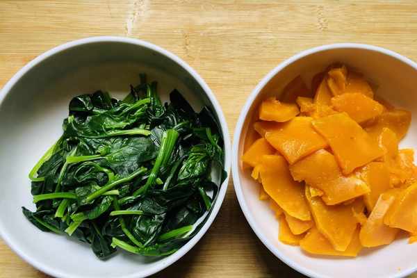 1.首先把菠菜的根部去掉,然後浸泡5分鐘洗凈備用;南瓜去皮,然後切成小薄片備用。