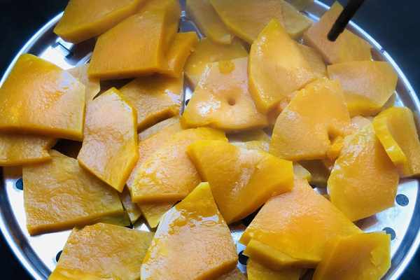 3.南瓜放入蒸盤上,大火蒸至軟爛。能夠用筷子戳出一個洞即為軟爛熟透。