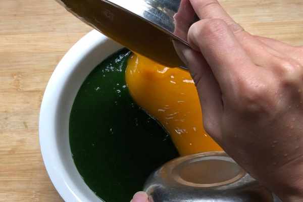 13.首先拿起兩個容器(廚房裡叫碼兜),然後相對倒入菠菜羹和南瓜羹。