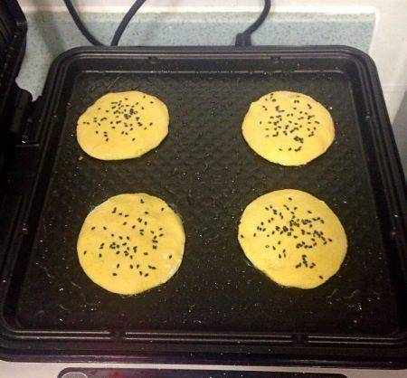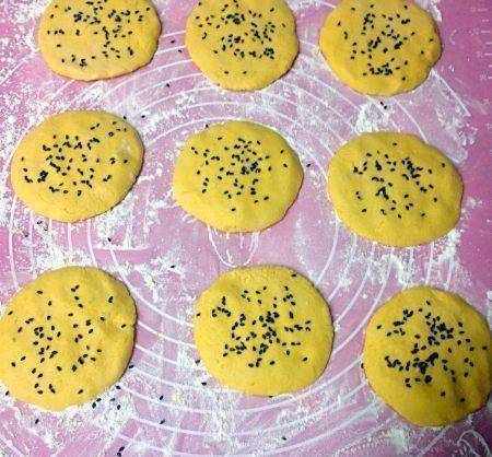 分步取一小塊面團,揉成圓餅狀,表面撒些黑芝麻。