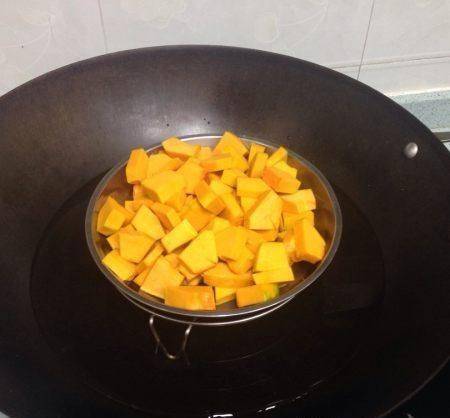 將南瓜切成小塊,放入鍋中冷水蒸20分鐘。