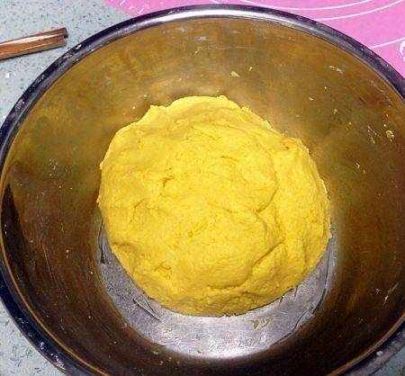 打一個雞蛋,分次加入糯米粉,直到南瓜和糯米粉混合,揉成略帶粘性但有韌性的面團。