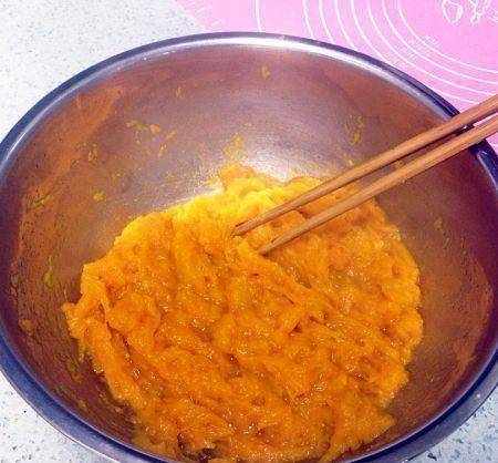 蒸好的南瓜取出,倒掉蒸好的液體,加入適量的白糖和少許鹽攪拌成糊狀。
