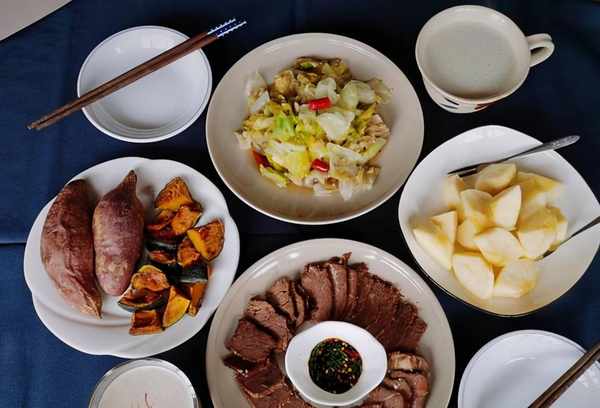鷹嘴豆漿可以晚上預約煮,添加少量燕麥或小米做出的豆漿口感更順滑。我傢是二人份,鷹嘴豆60克,燕麥30克混合淘洗後放入破壁機裡,加入800克凈水,預約豆漿模式即可。主食烤紅薯和貝貝南瓜,洗凈後放入烤箱裡就可,不用看管,時間可用來洗漱整理個人衛生。小菜是快手的蒜茸生菜,醬牛肉一次做好吃三天,省事。