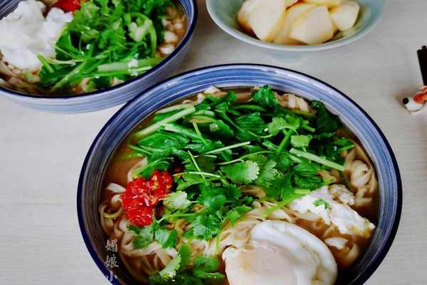 六、雞湯青菜面+蘋果雞蛋打入碗裡,湯鍋加水燒開,用勺子劃圈攪動兩圈形成旋渦,趕緊倒入雞蛋,這樣雞蛋不會沉鍋底自然就不會粘鍋瞭,雞蛋完整不會破。中小火煮至雞蛋凝固,撈出。然後再將面條下入鍋裡,加一點點鹽煮至面條柔軟無硬心,放入1把小白菜煮10秒鐘,撈出面條和小白菜裝碗,倒入準備好的雞湯,加入雞蛋、香菜段,依據自己口味再加少量辣椒醬和醋即好。
