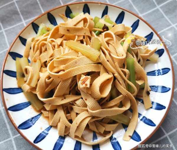 2,鍋裡放入花生油,放入蔥薑絲煸炒出香味,倒入豆腐皮炒勻,加入半勺生抽,加入少許鹽炒勻,出鍋即成。