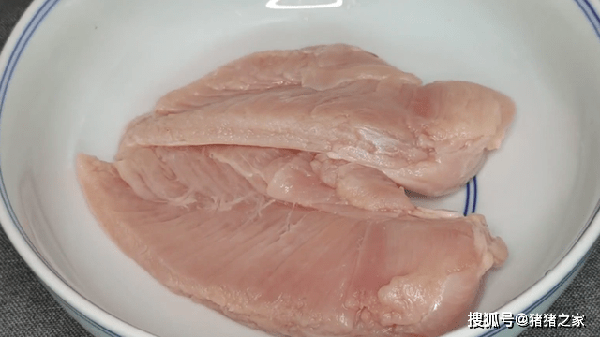 1.準備兩塊雞胸肉,先加入一把面粉,然後用手抓一抓,面粉有很好的吸附能力,可以把雞胸肉清洗得更加幹凈。 兩分鐘左右,用清水沖洗幹凈。接著把雞胸肉改刀切成厚一點的片,在菜板上撒上一些幹淀粉,再把切好的雞肉片兩面都粘上一層淀粉,用搟面杖輕輕地敲打,把淀粉都敲打進雞肉裡面,這樣做出來的雞胸肉吃起來又滑又嫩,然後再改刀切成小一點的片備用。