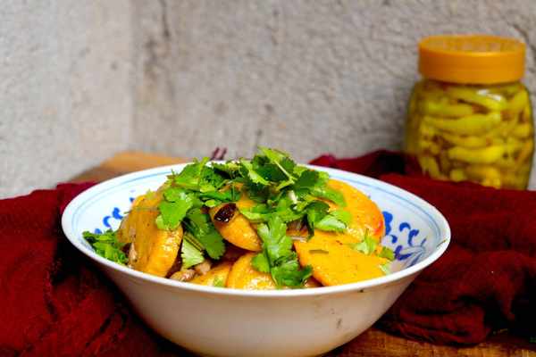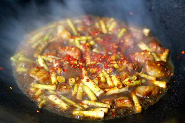 3、炒香之後,放入我們準備好的野山筍,不斷的進行翻炒,接著放入鹽加入少許辣椒面。
