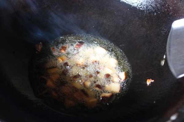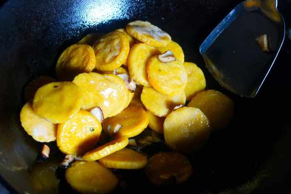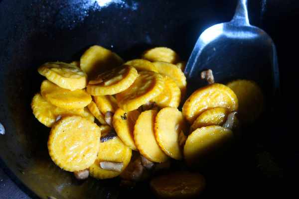 2、鍋中放入植物油,燒熱之後,放入蘑菇開始翻炒,把它炒香之後,放入玉米粑粑。