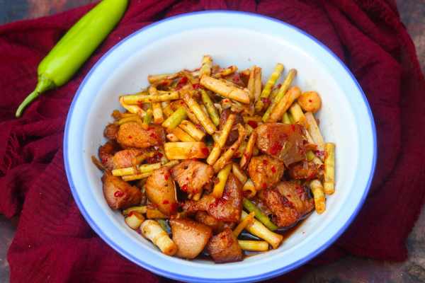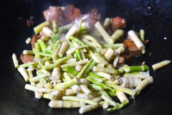 所需食材:野山筍、豬肉、植物油、鹽、醬油半勺、辣椒面、蒜末、薑、蠔油半勺