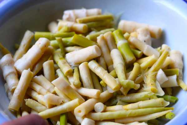 1、把野山筍拔回傢之後,去掉它外面的殼,接著焯水,然後切成段,留著備用。
