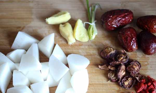 2:配料準備好;蘿卜切滾刀塊、生薑拍扁、小蔥捆起來、紅棗、山楂用水清洗掉灰塵。