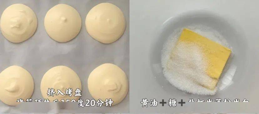 4.裝入裱花袋,擠入烤盤,烤箱預熱後150度烤20分鐘,出爐晾涼翻面墊上蛋糕紙,杏仁片平鋪放入烤盤,160度烤10分鐘備用,軟化的黃油➕糖➕鹽打發至蓬松發白