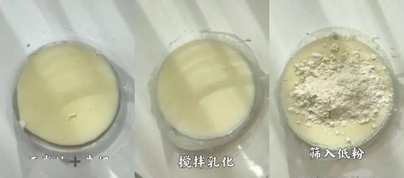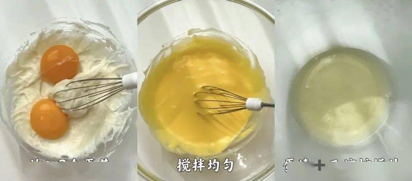 2.篩入低粉攪拌至無幹粉,加入蛋黃攪勻,蛋清加入幾滴檸檬汁