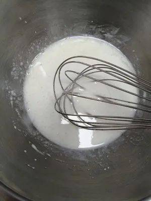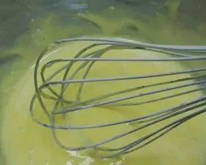 3、加入蛋黃攪拌均勻後提起來面糊是細膩流動狀態。