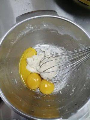 2、加入過篩的粉類攪拌均勻無顆粒,加入蛋黃。