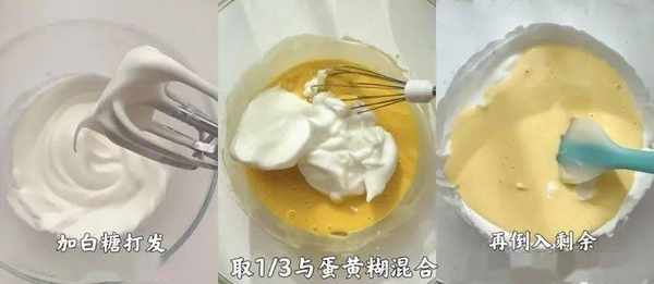 3.邊打發邊加入糖,打發至小彎鉤狀態,蛋白霜分兩次與蛋黃糊混合,翻拌的手法,不要過度攪拌
