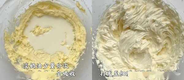 5.淡奶油分次少量加入打發至完全吸收,裝入裱花袋