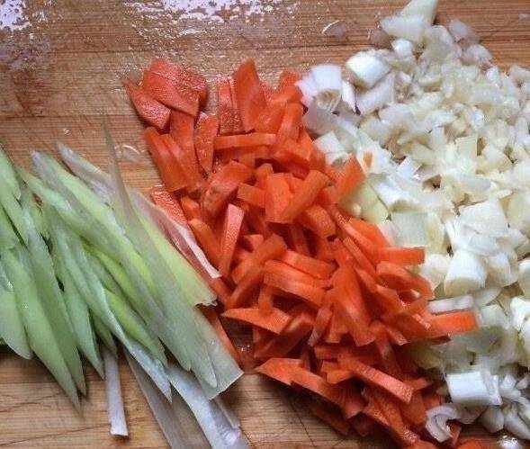 然後我們來處理食材:生薑洗凈後去皮切成片,香蔥摘掉傷葉後去蒂洗凈切成段,大蒜剝皮後拍成末,粉絲提前泡發,然後放在盤底備用,當然喜歡吃千張的也可以用千張來替代哦,胡蘿卜去皮後切成小段放置備用。