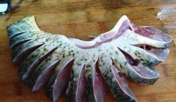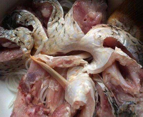 買鯉魚的時候商販就處理好瞭,回來清洗幹凈就差不多可以瞭,把魚頭切下來,魚背上和肚子上劃幾刀,不要切斷,然後用生薑片、食用鹽、料酒、白醋、醬油等食材醃制半小時,這樣就能更好的去腥味。