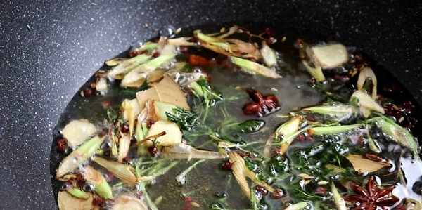 2、鍋裡倒入稍微多一些的油,一般做醬還是建議油稍微多一些,這樣保存的時間會更加的長。油微熱以後轉小火加入花椒、八角、桂皮、香葉、小茴香,再加入生薑片、蔥段還有香菜進去用小火慢炸。這裡一定要有耐心哦,一直要把這些香料裡的香味完全炸出來,炸至顏色變幹黃後瀝油撈出來!整個過程大約15分鐘左右,當然這個也是根據大傢的量來衡量的,千萬不要炸糊,要不然不健康,還會有怪味的!