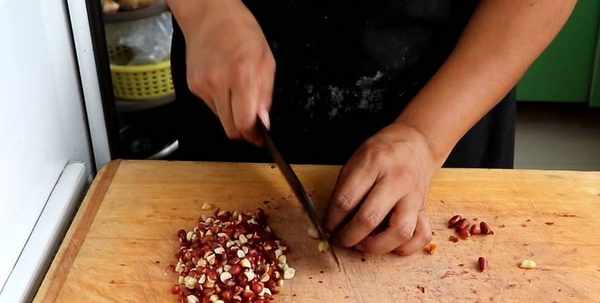 再把提前做好的油炸花生米切成兩半備用,花生皮根據自己的喜好來決定它的去留!