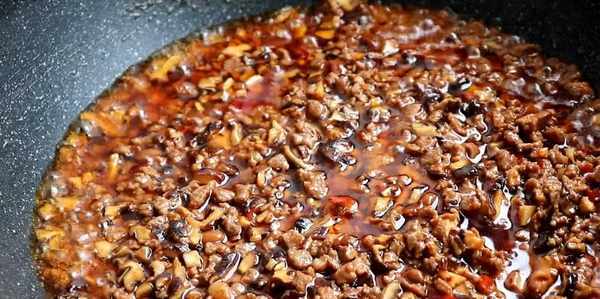 直到把牛肉裡的水分炒幹後,再加入2勺豆瓣醬和黃豆醬炒香,炒出紅油。