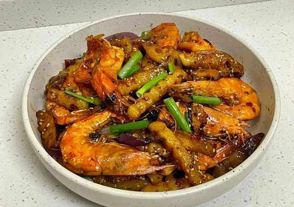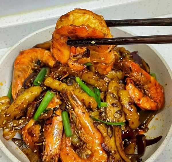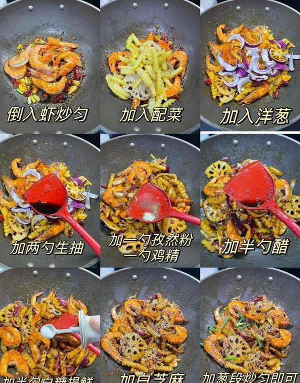 5:倒入我們煎好的蝦、土豆和藕片翻炒均勻後加入配菜洋蔥大火翻炒兩下